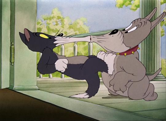 大狗史派克在本片中第一次出场了,跟之后的形象貌似也没有什么太大的差异,而且那种谁招惹他就跟谁干的脾气也是跟之后的人设异曲同工,在这部前期作品里面感觉杰瑞的战斗值比之后的人设低了好多,只能靠着跟汤姆合作共同对付史派克,猫和老鼠这种在战斗中升华的友谊看上去还是非常有爱的,也是难得一见